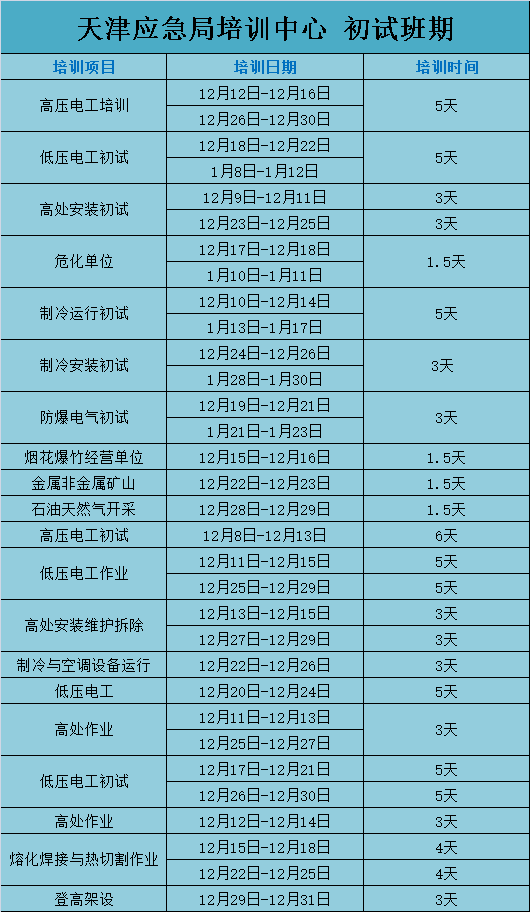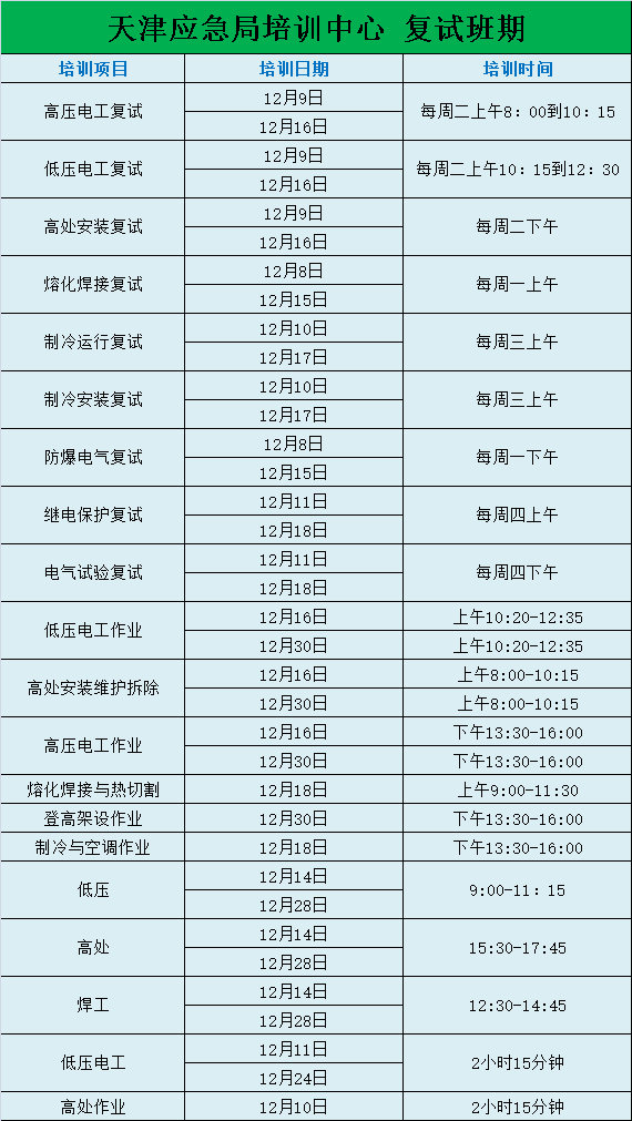 25年12月天津特种作业上岗证初试复试/高压/低压、防爆电气、电力电缆、制冷安装/运行、高处/登高架设、熔化焊接、危化品开班通知