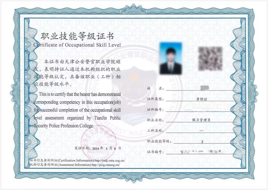 考试分为理论和实际操作而项,考试合格由天津市社会培训评价机构-天津警察学院颁发《保卫管理员职业技能等规证书》,证书可以在国家人社部被能人才评价证书全国联网查询”平台(https://www.osta.org.cn/)查询。