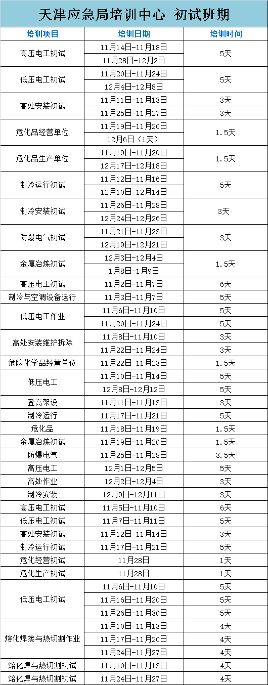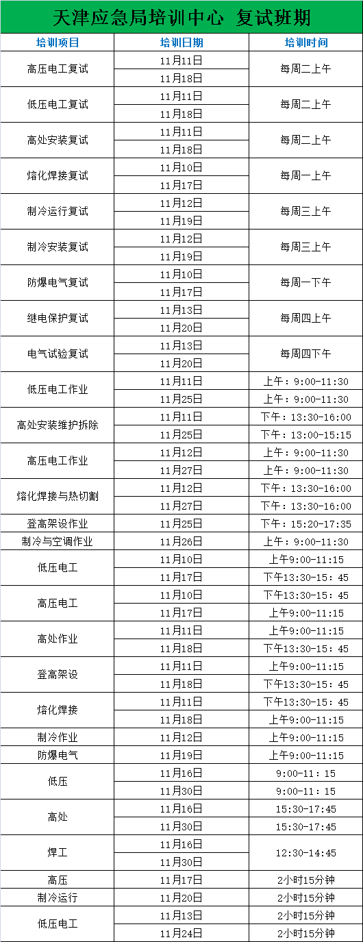 25年11月初试复试|天津特种作业上岗证高压/低压、防爆电气、电力电缆、制冷安装/运行、高处/登高架设、熔化焊接、危化品开班通知