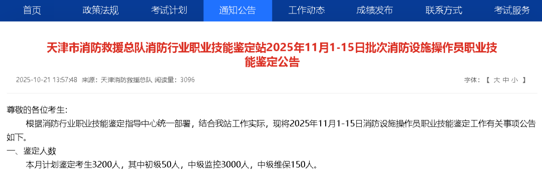 【天津考试】2025年11月上半月天津消防设施操作员职业技能鉴定公告