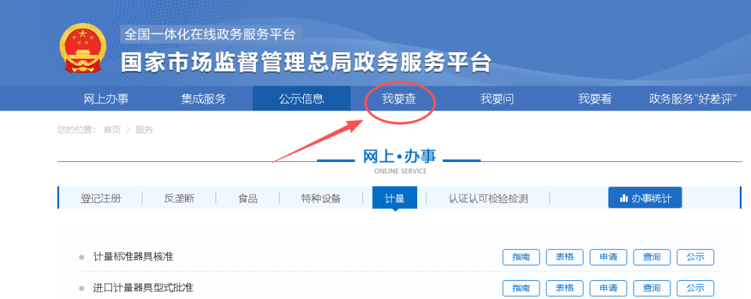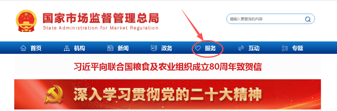 第一步:通过官方网址https://www.samr.gov.cn/进去“国家市场监督管理总局官网”,点击“服务”跳转下个页面