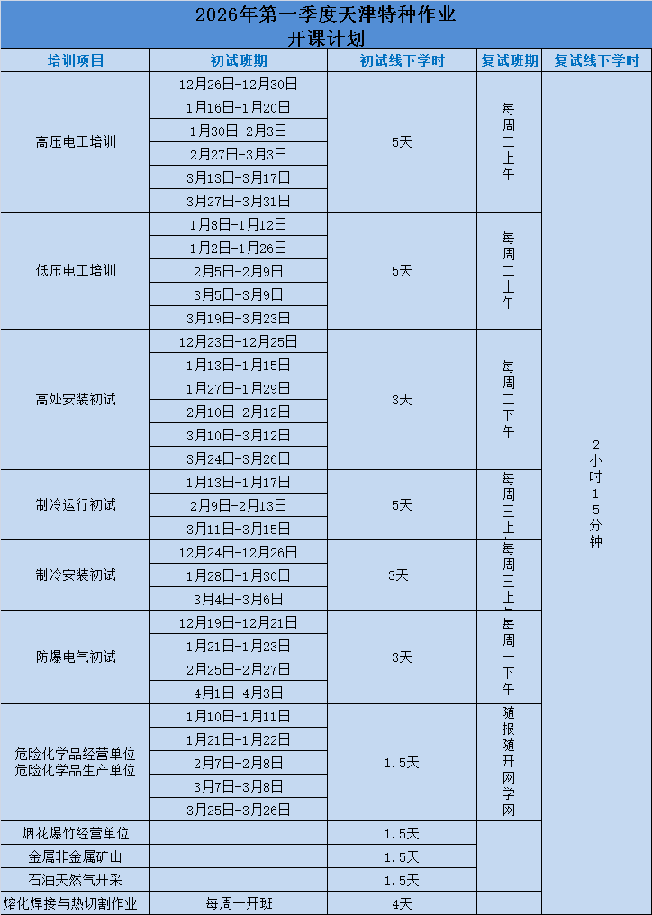 为严格执行《安全生产法》《特种作业人员安全技术培训考核管理规定》(国家安全生产监督管理总局令第30号,以下简称“30号令”)第五条“必须经专门培训并考核合格,取得《中华人民共和国特种作业操作证》后,方可上岗作业”的要求,方便各单位提前统筹安排职工培训与持证复审工作,现将《天津2026年第一季度特种作业人员安全技术培训开班计划》予以正式公布,并就有关事项通知如下: