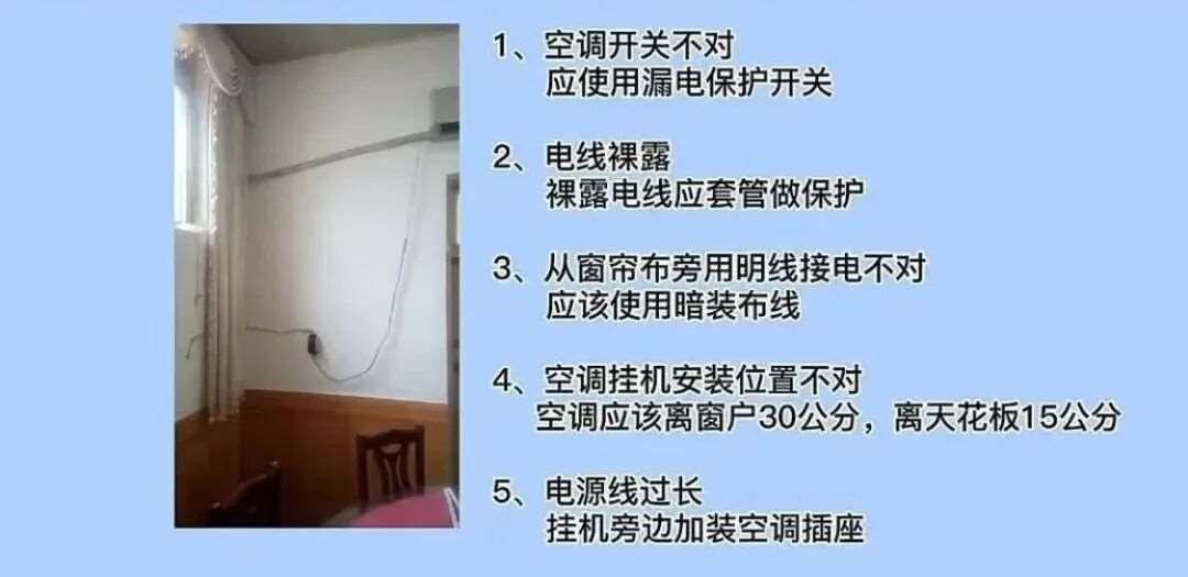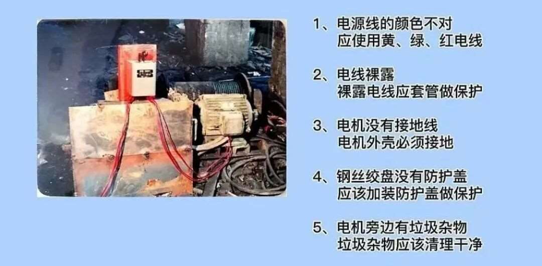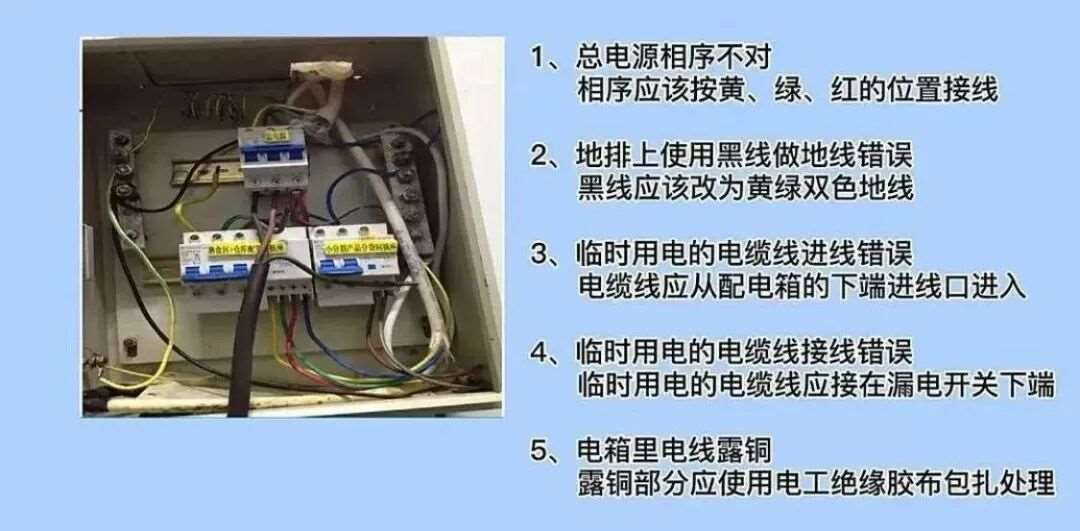 8. 电源电线颜色不对,相线应使用黄、绿、红的电线。