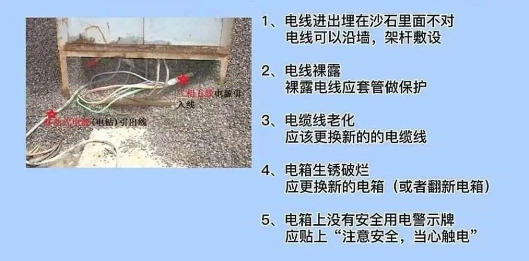 10.临时用电的电缆线进线错误,电缆线应从配电箱的下端进线口进入。