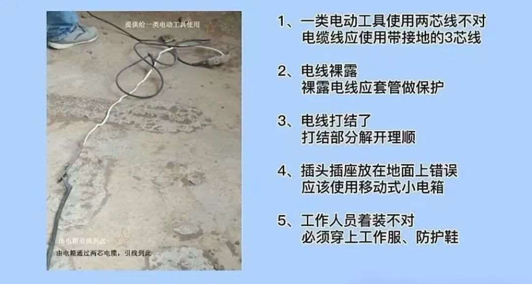 20.插头插座放在地面上错误,应该使用移动式小电箱。